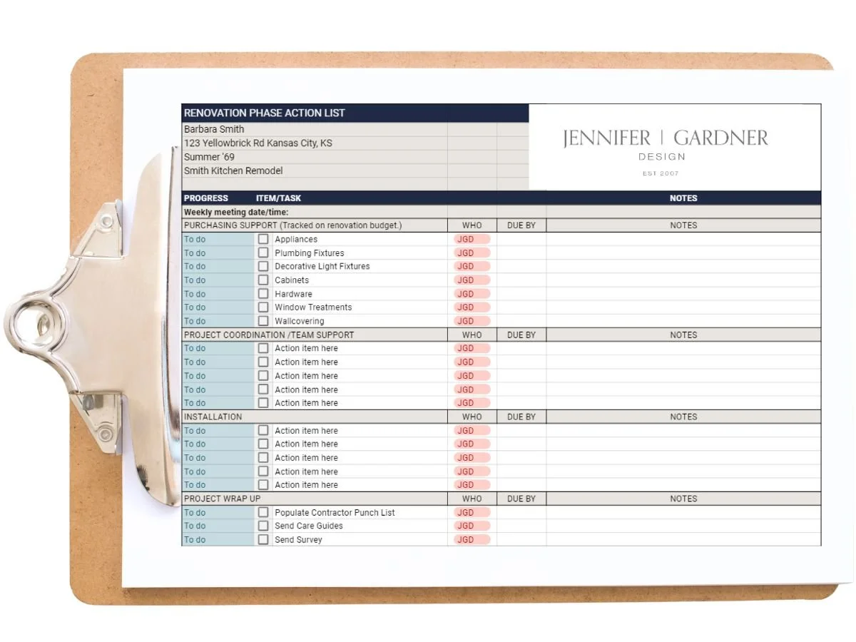 At every meeting, a designated note taker compiles a list of actions that need to be addressed in order to keep your project moving forward. This could be anything from finalizing a paint color to revising an element of the design based on an unexpected condition discovered during the demo.