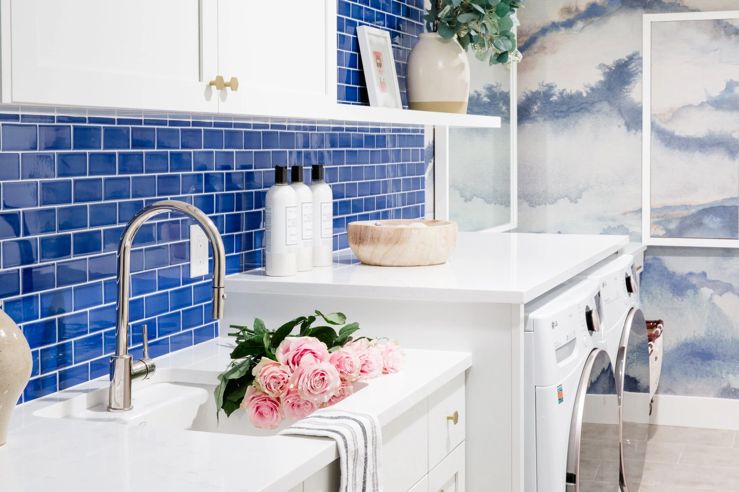 Let’s not forget about the basics. Clear glass jars labeled for items such as laundry pods and dryer balls help keep your laundry room organized. Trays or small baskets are another great way to organize your laundry room essentials. Even the smallest details can make a big impact when you’re designing for convenience in the laundry room!