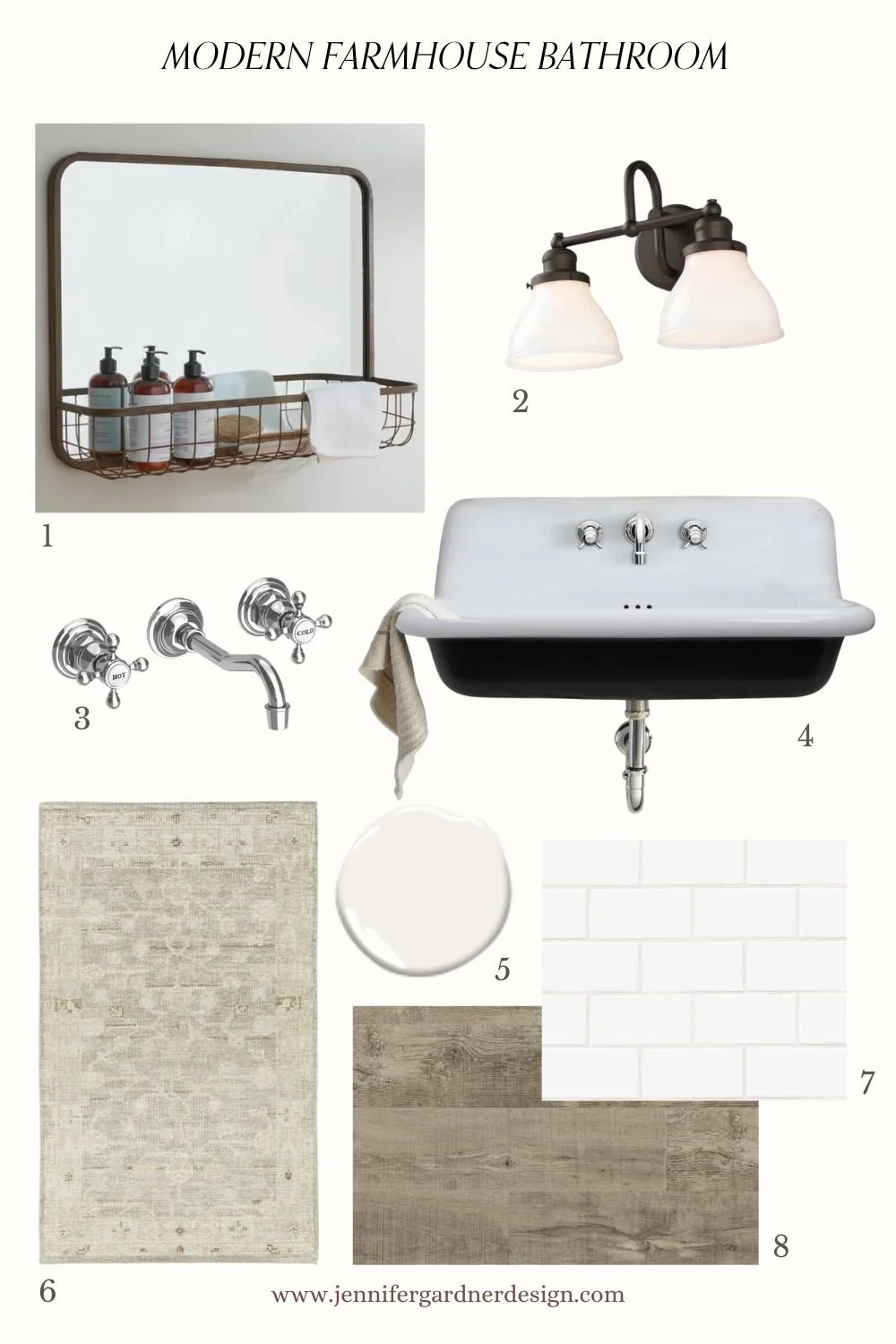 (1) Wall Mirror (2) Wall Paint (3) Wall Sconce (4) Faucet (5) Vanity (6) Floor Tile (7) Wall Storage Baskets (8) Shower Wall Tile