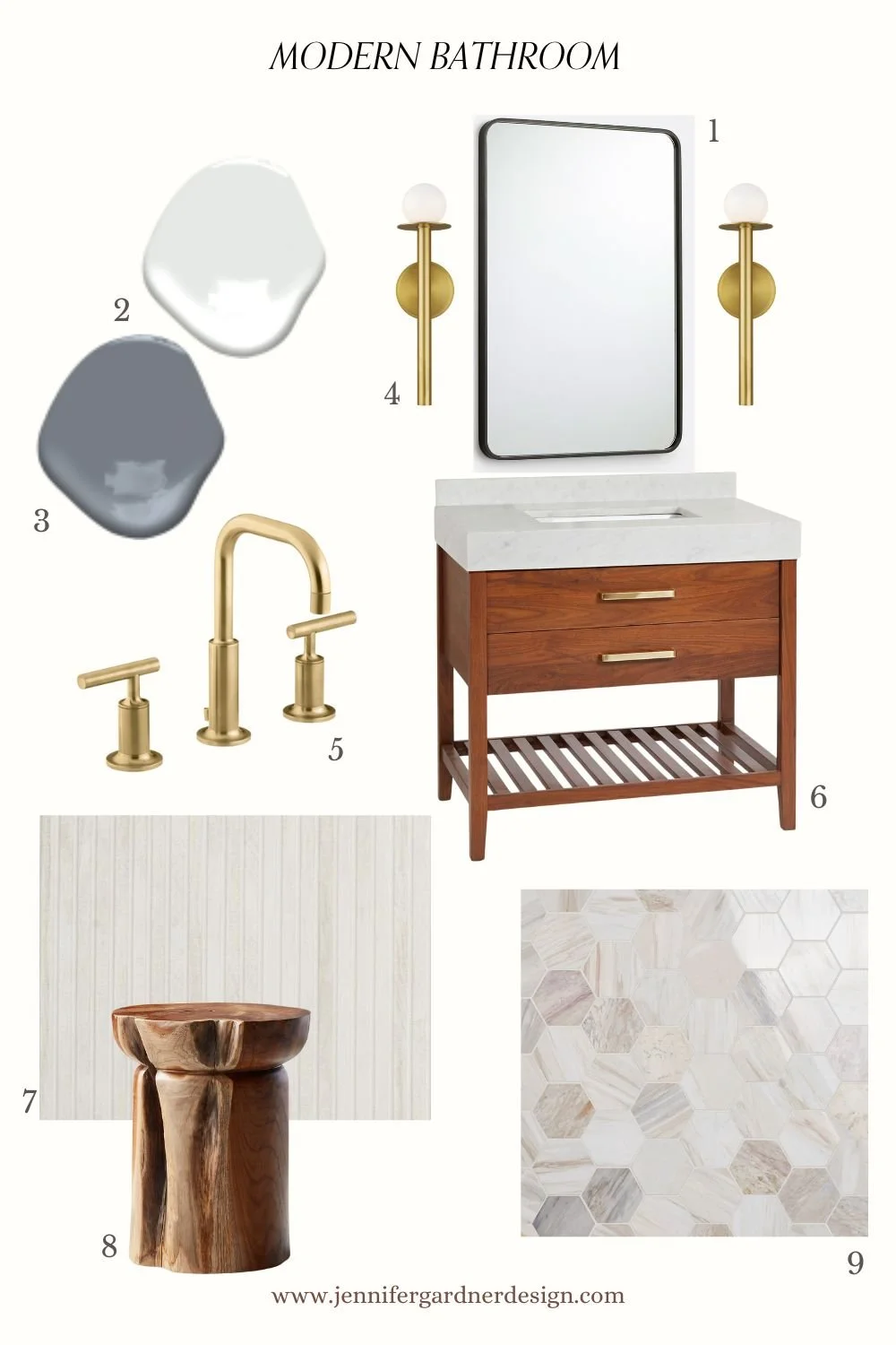 (1) Wall Mirror (2) Trim Paint (3) Wall Paint (4) Wall Sconce (5) Faucet (6) Vanity (7) Shower Wall Tile (8) Stool (9) Floor Tile