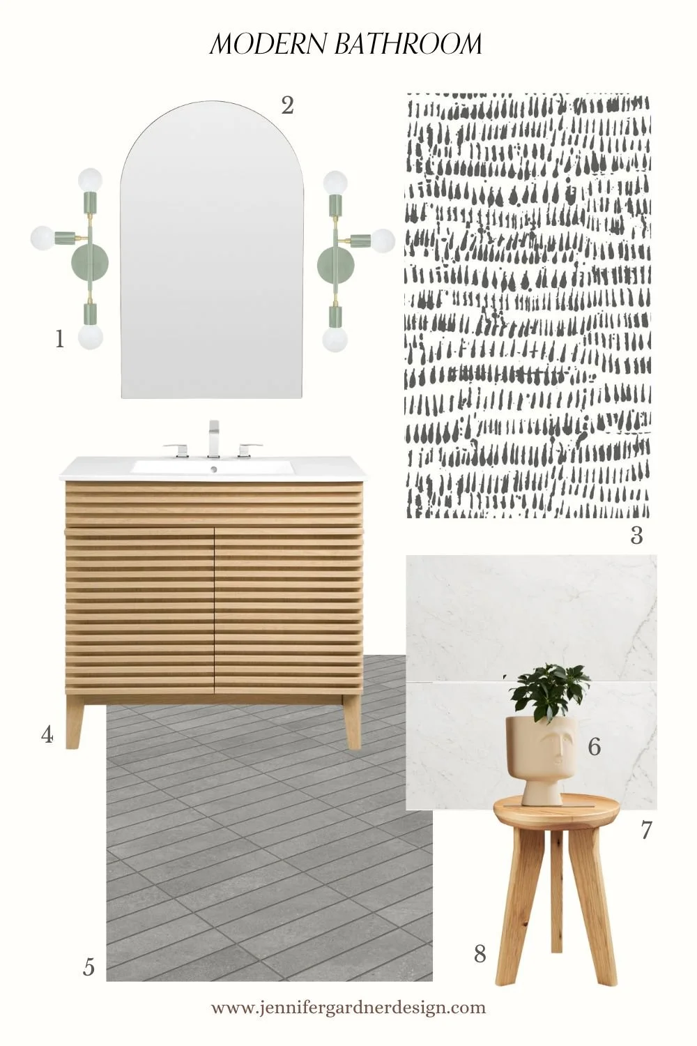 (1) Wall Sconces (2) Wall Mirror (3) Wallpaper (4) Vanity (5) Floor Tile (6) Planter (7) Shower Wall Tile (8) Stool