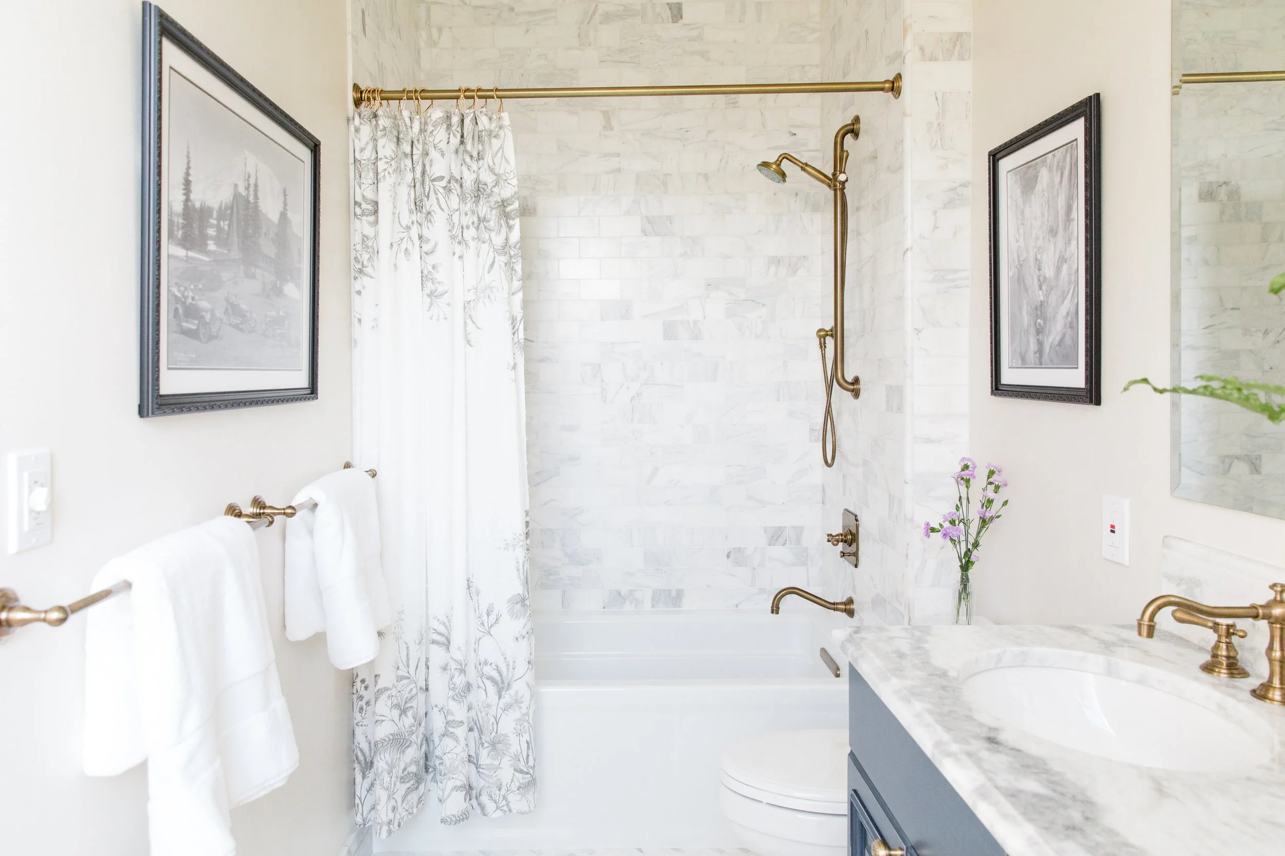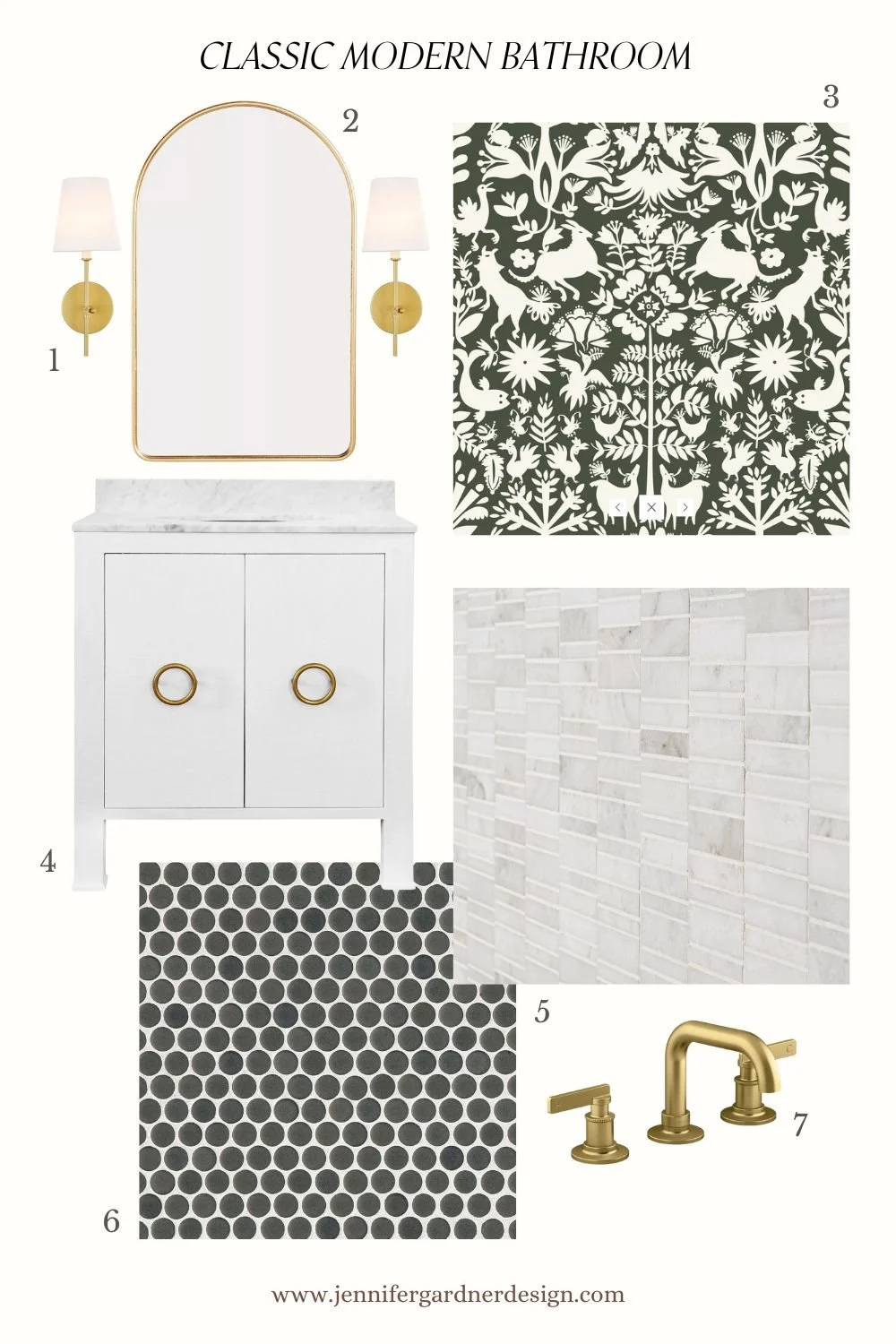 (1) Wall Mirror (2) Wall Sconces (3) Wallpaper (4) Vanity (5) Floor Tile (6) Shower Wall Tile (7) Faucet