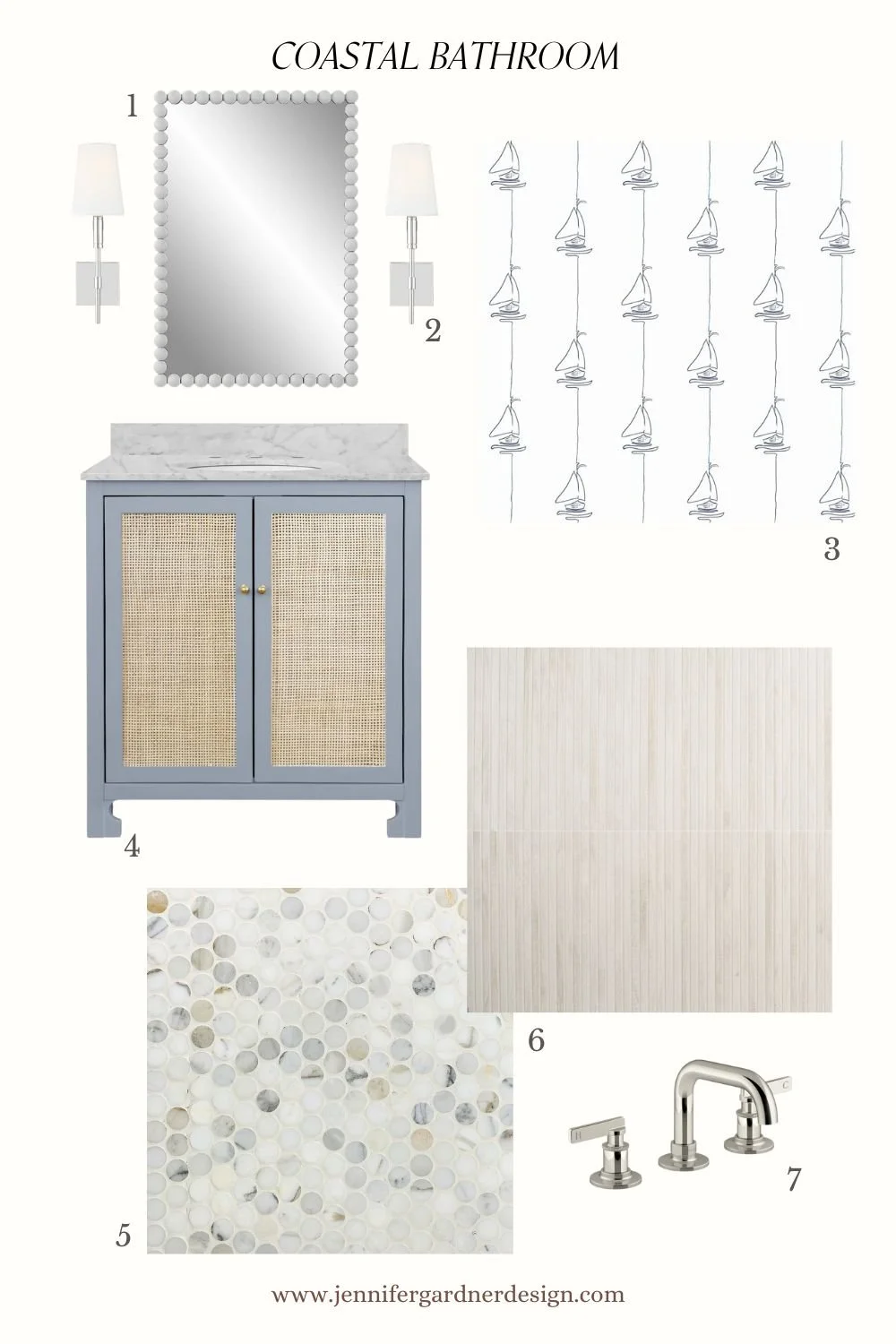 (1) Wall Sconces (2) Wall Mirror (3) Wallpaper (4) Vanity (5) Shower Wall Tile (6) Floor Tile (7) Faucet