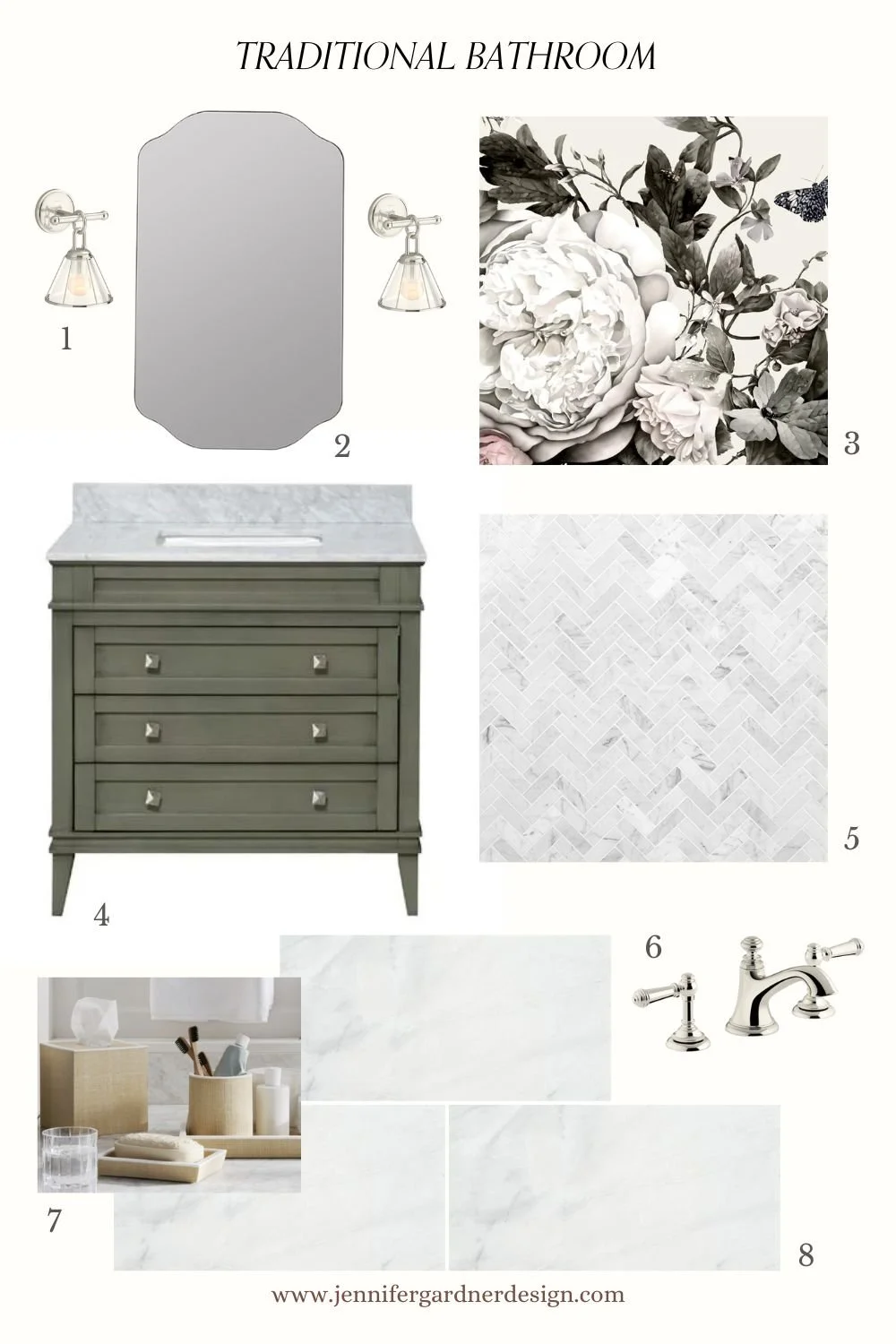 (1) Wall Sconce (2) Wall Mirror (3) Wallpaper (4) Vanity (5) Floor Tile (6) Faucet (7) Bathroom Accessories (8) Shower Wall Tile