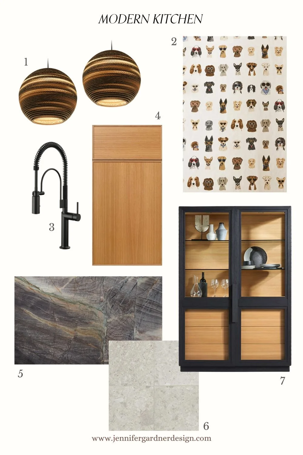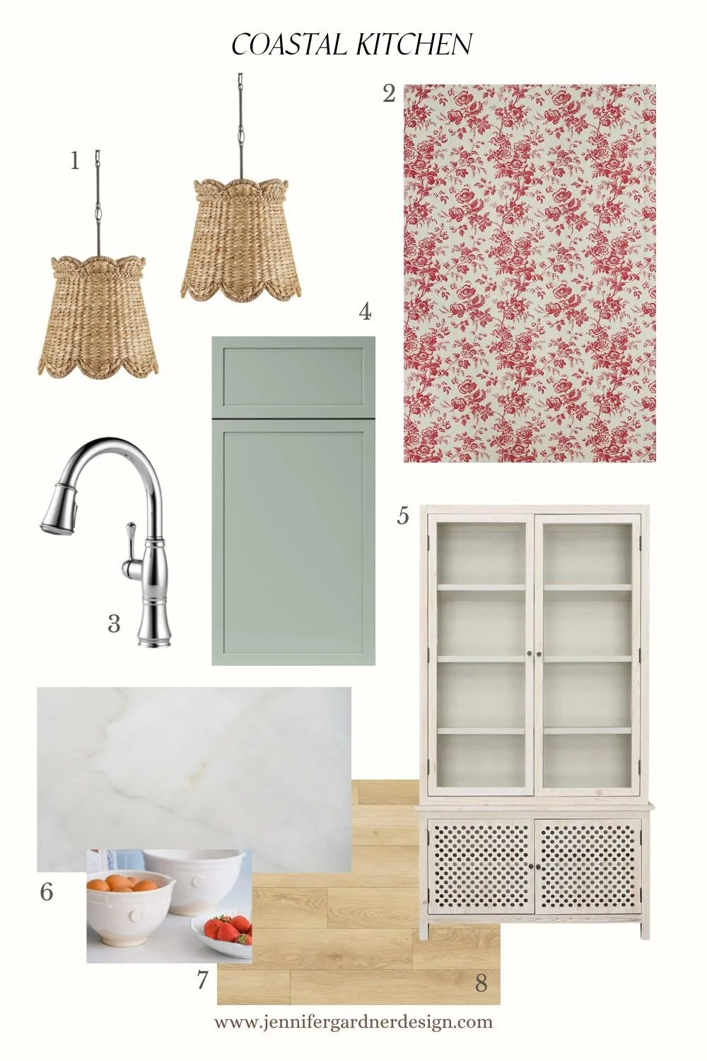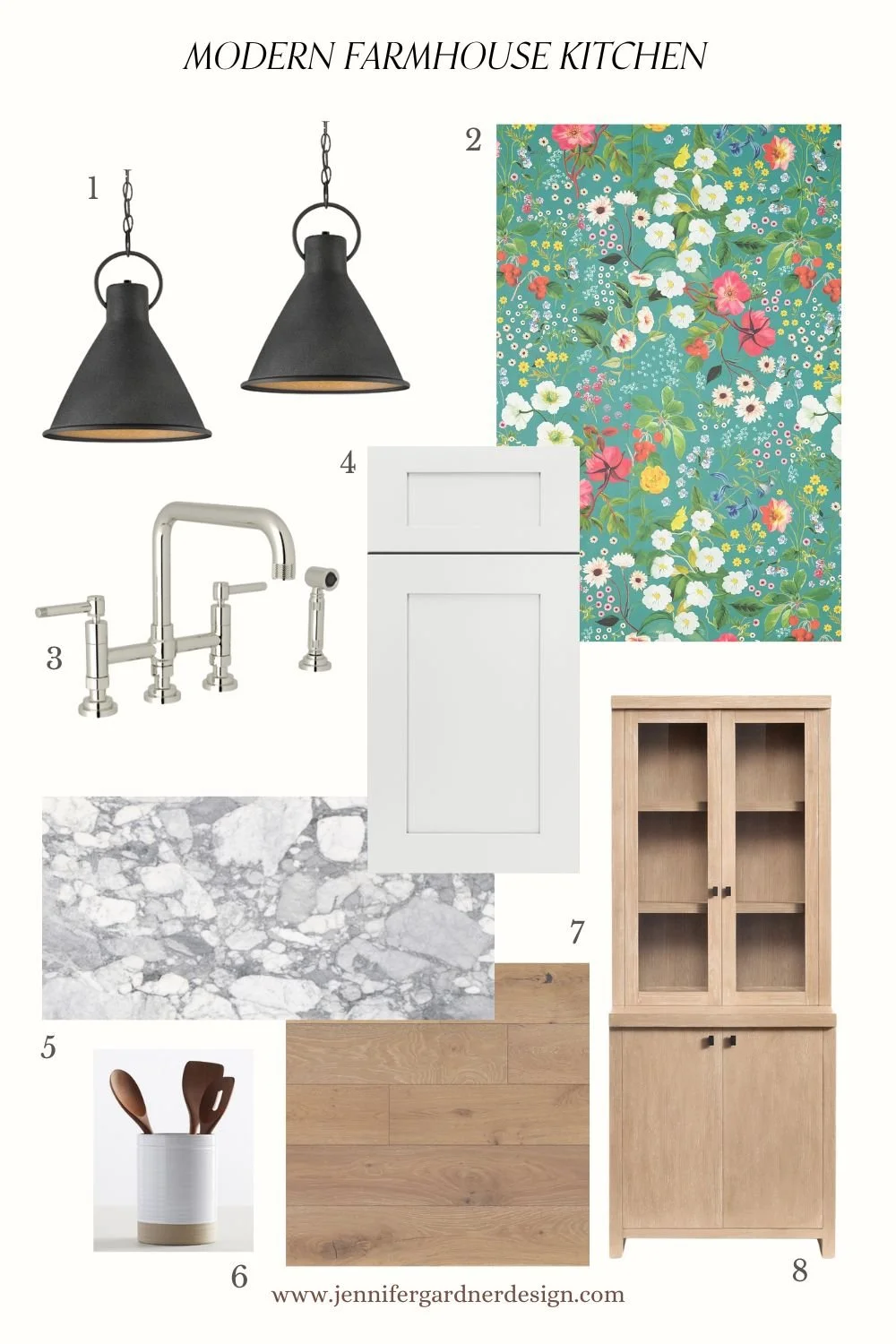 (1) Pendant Light Fixtures (2) Wallpaper (3) Faucet (4) Cabinet Door Style (5) Quartzite Counter (6) Floor Tile (7) Kitchen Storage