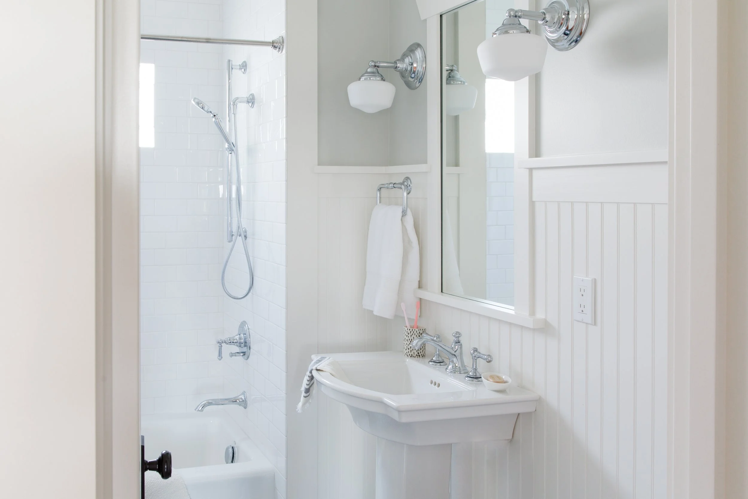 (1) Wallpaper (2) Wall Sconces (3) Wall Mirror 4) Shiplap (5) Sink Faucet (6) Sink (7) Towel Ladder (8) Shower Wall Tile (9) Floor Tile