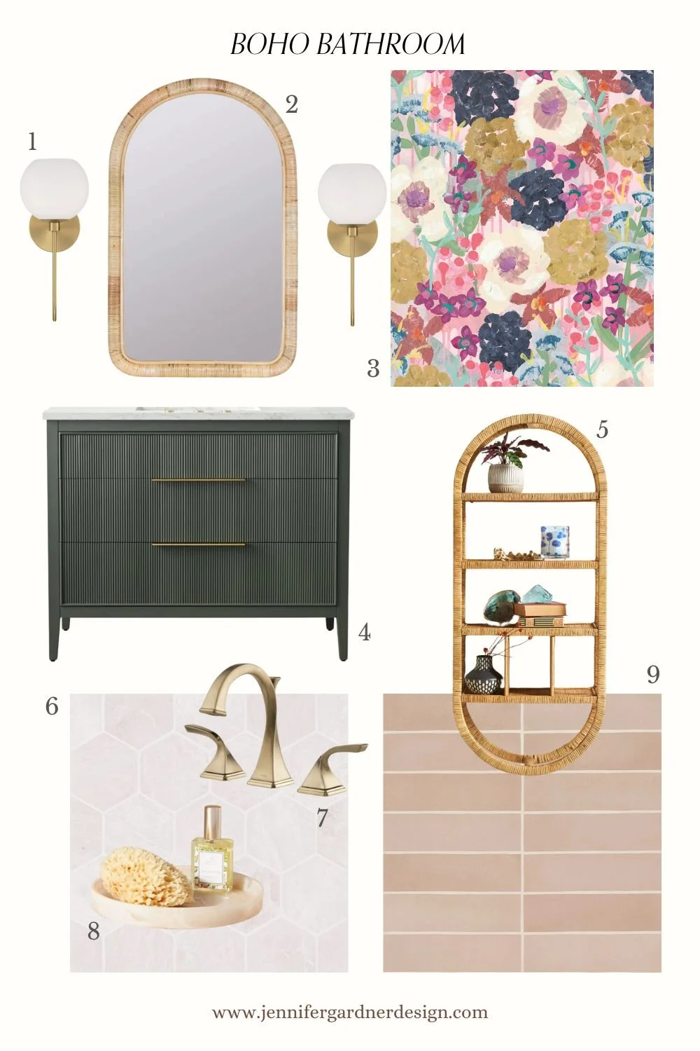 (1) Wall Sconce (2) Wall Mirror (3) Wallpaper 4) Vanity (5) Wall Storage (6) Floor Tile (7) Faucet (8) Bathroom Accessories (9) Shower Wall Tile
