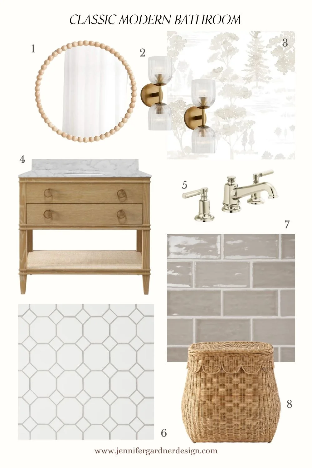 (1) Wall Mirror (2) Wall Sconce (3) Wallpaper (4) Vanity (5) Sink Faucet (6) Floor Tile (7) Shower Wall Tile (8) Laundry Hamper