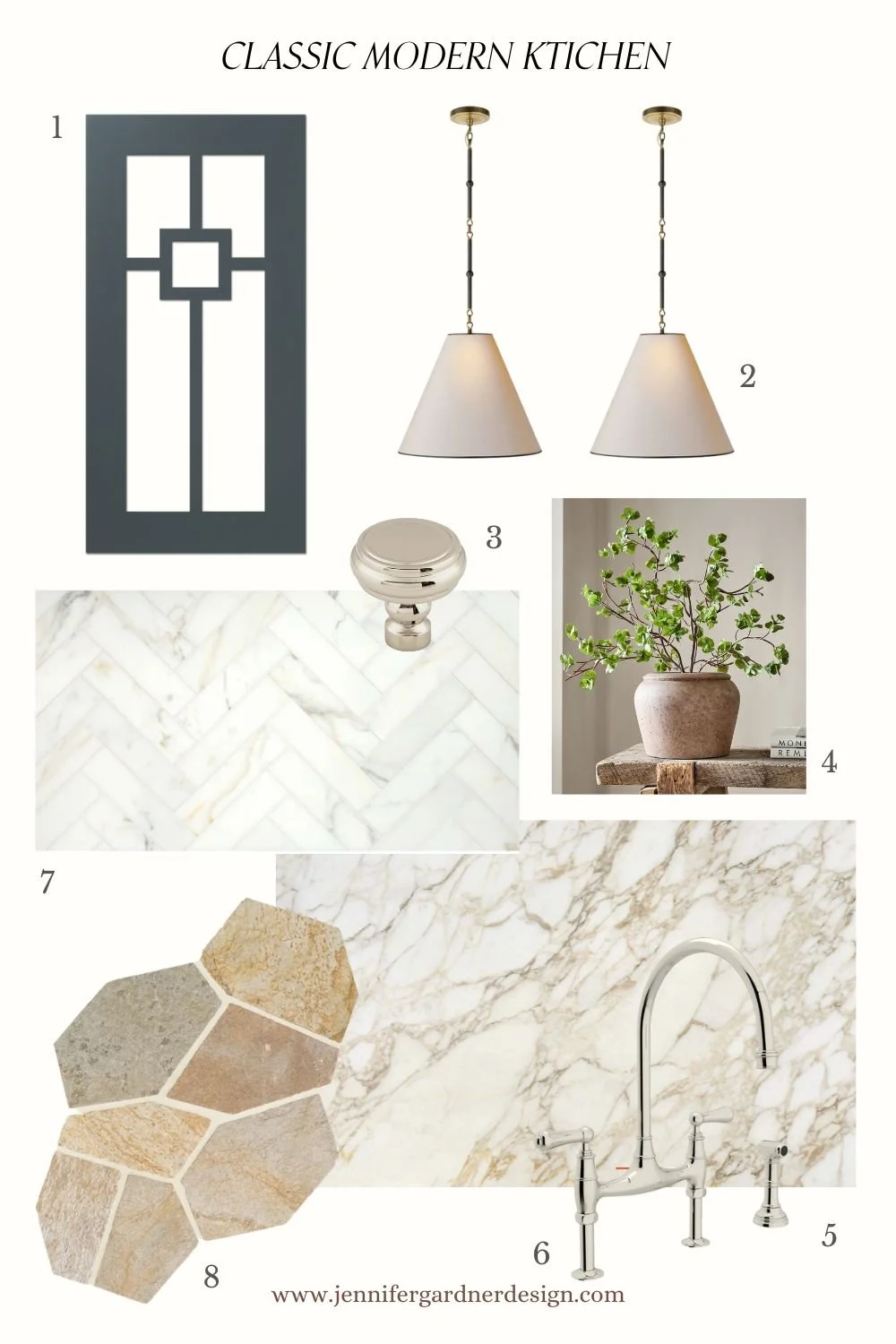 (1) Painted Cabinets (2) Pendant Light Fixtures (3) Cabinet Knob (4) Vase (5) Marble Counter (6) Bridge Faucet (7) Backsplash (8) Floor