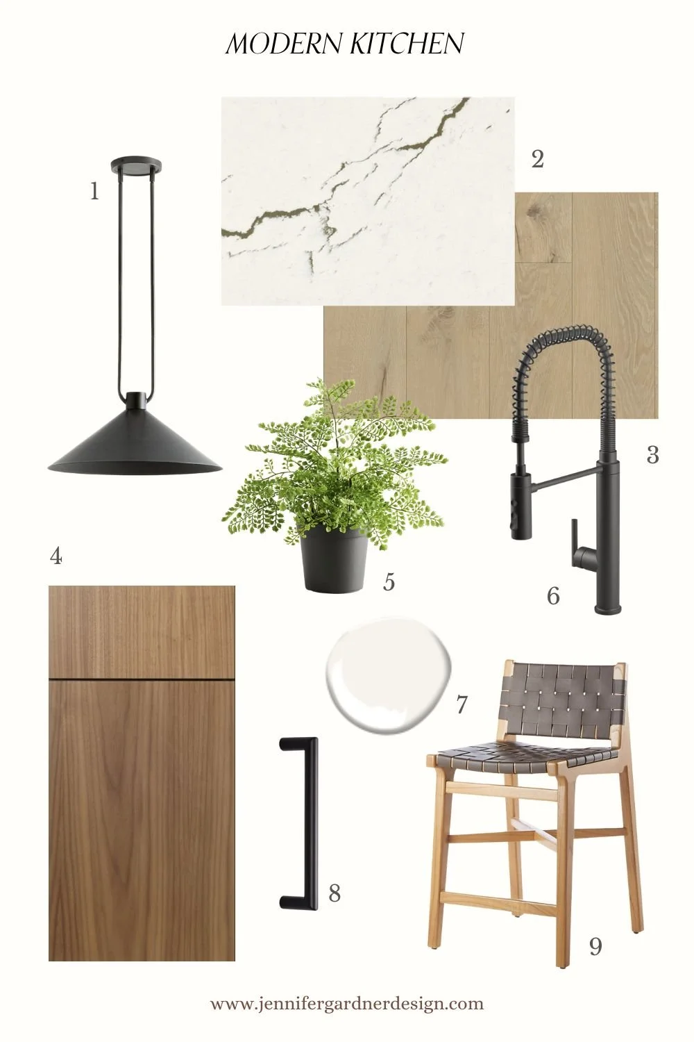 (1) Pendant Light Fixture (2) Counter (3) Faucet (4) Stained Cabinets (5) Potted Faux Plant (6) Faucet (7) Wall Paint Color (8) Cabinet Pull (9) Barstool