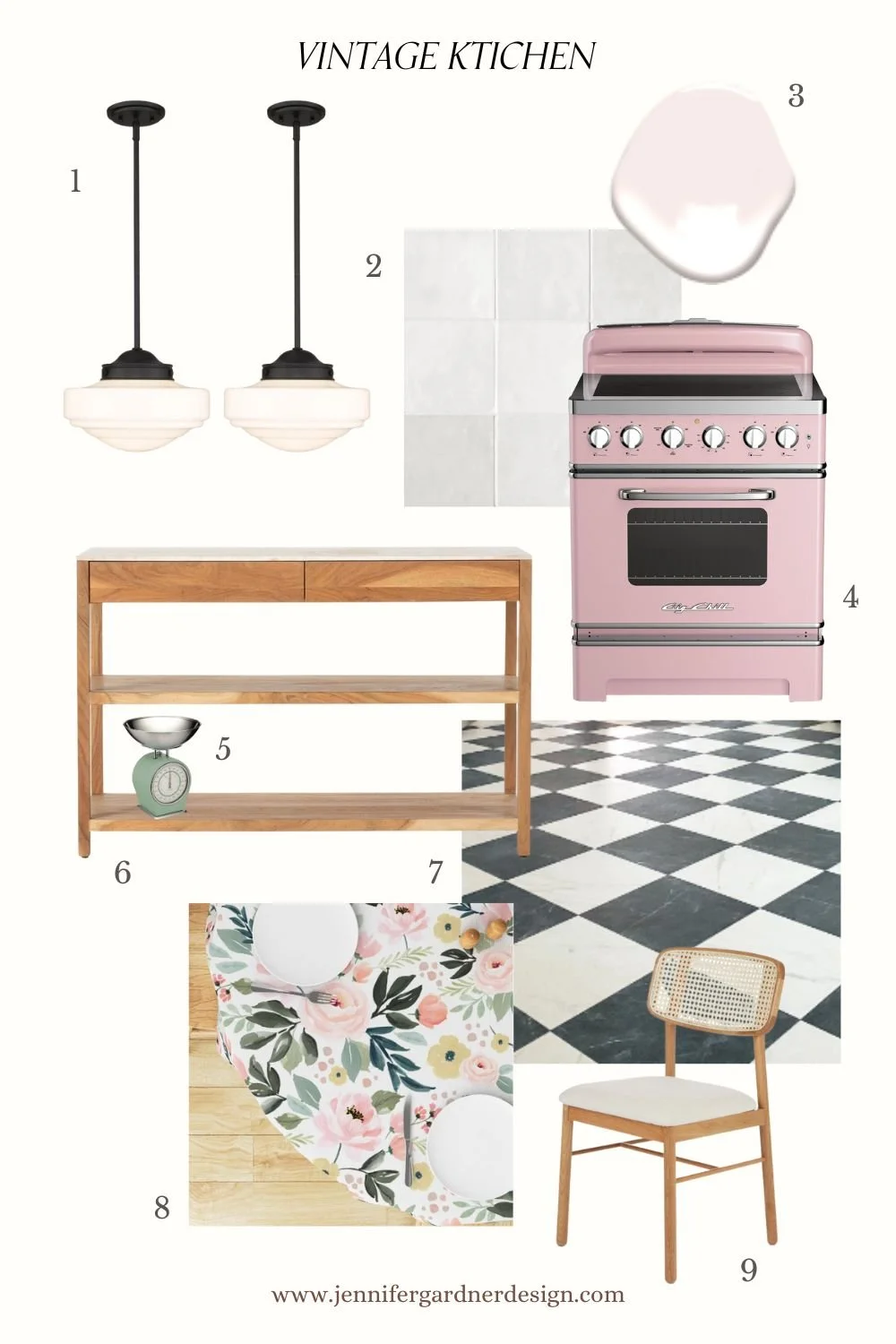 (1) Pendant Light Fixtures (2) Backsplash Tile (3) Cabinet Paint Color (4) Range (5) Vintage Scale (6) Kitchen Island (7) Black and White Marble Floor Tiles (8) Tablecloth 9) Dining Chair