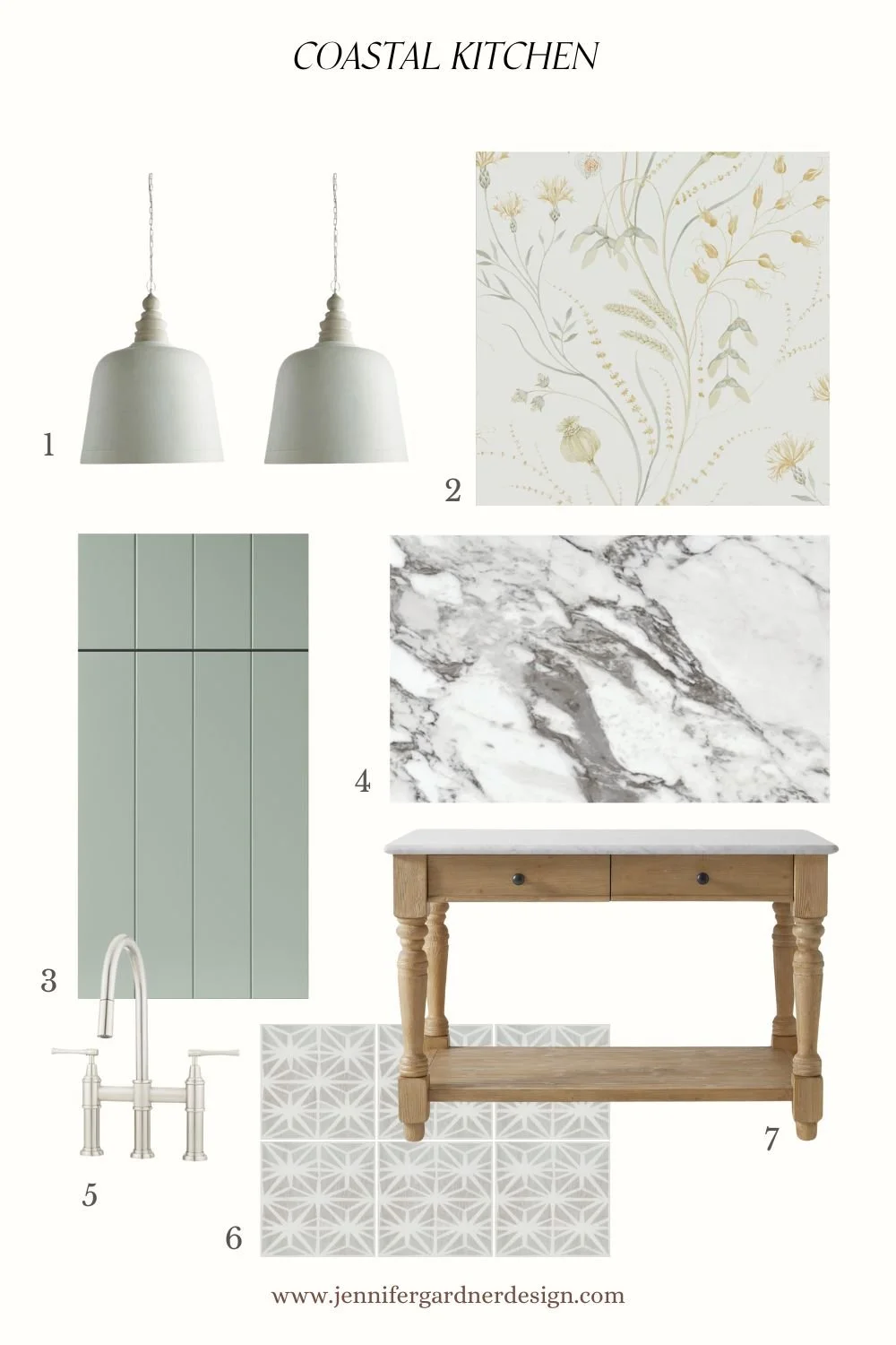 (1) Pendant Light Fixtures (2) Wallpaper (3) Cabinet Door Style (4) Marble Counter and Backsplash (5) Faucet (6) Painted Wood Floor Tile (7) Kitchen Island