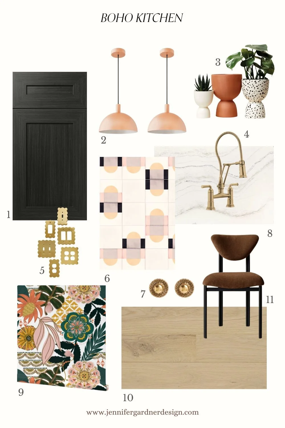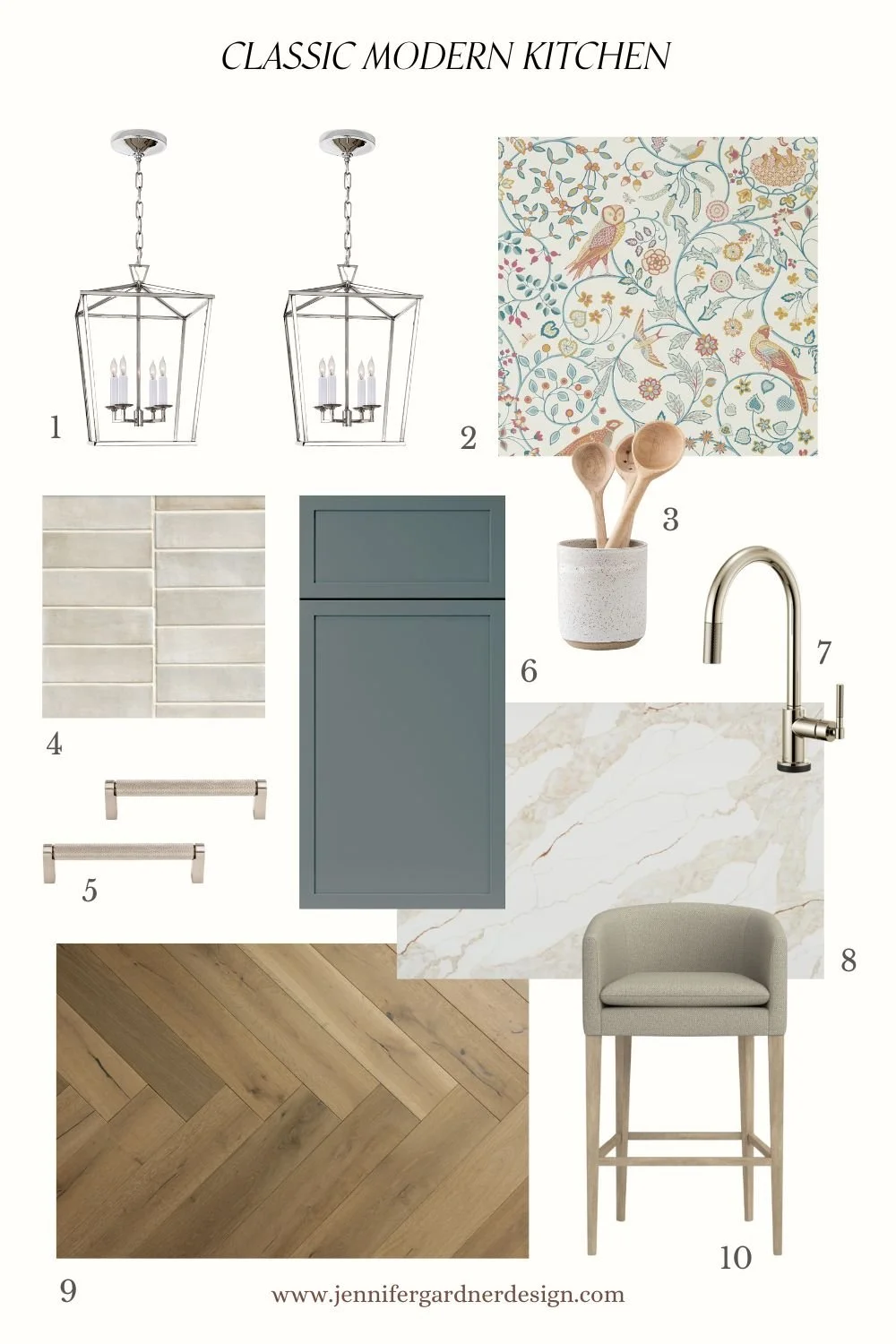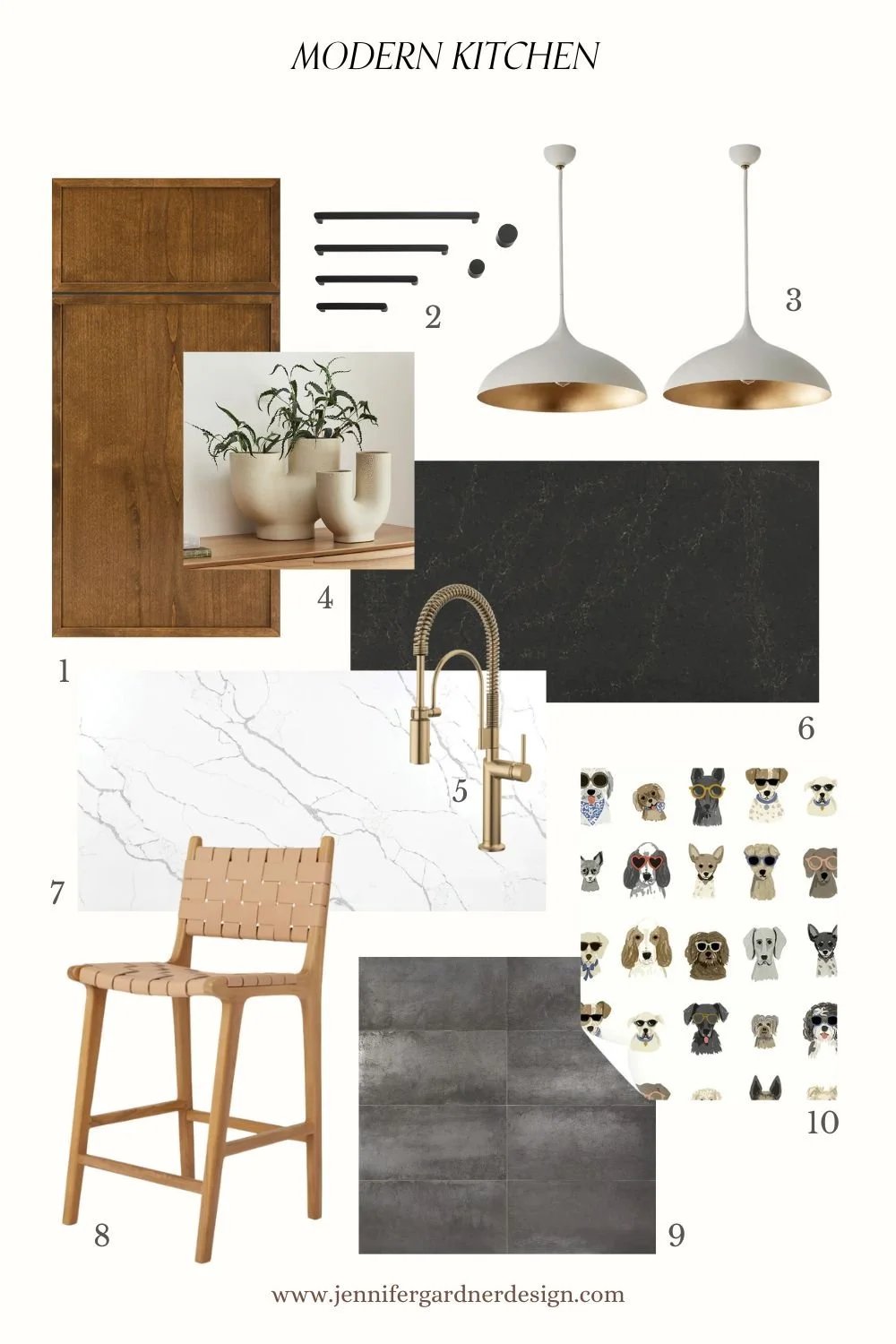(1) Cabinet Door Style (2) Cabinet Pulls & Knobs (3) Pendant Light Fixtures (4) Planters (5) Faucet (6) Island Quartz Counter (7) Perimeter Quartz Counter & Backsplash (8) Counter Stool (9) Tile Floor (10) Wallpaper