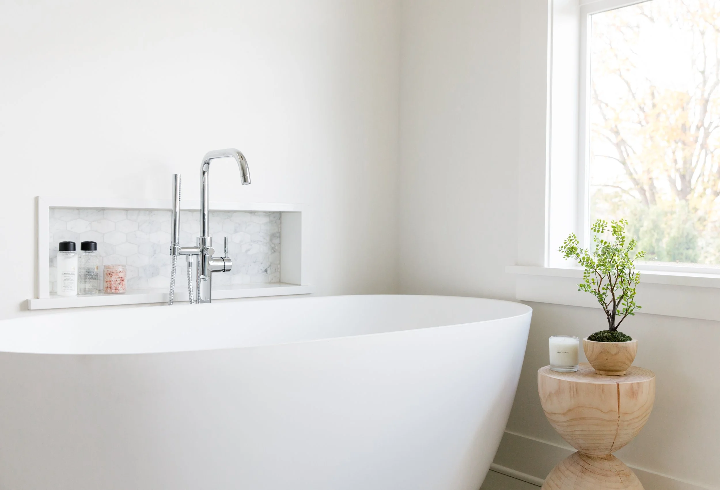 A small bench or stool can have so many functions! A place to set a candle and a glass of wine while you take a bath. A place to put a plant and add a little greenery to your bathroom. And, of course, a place to sit!