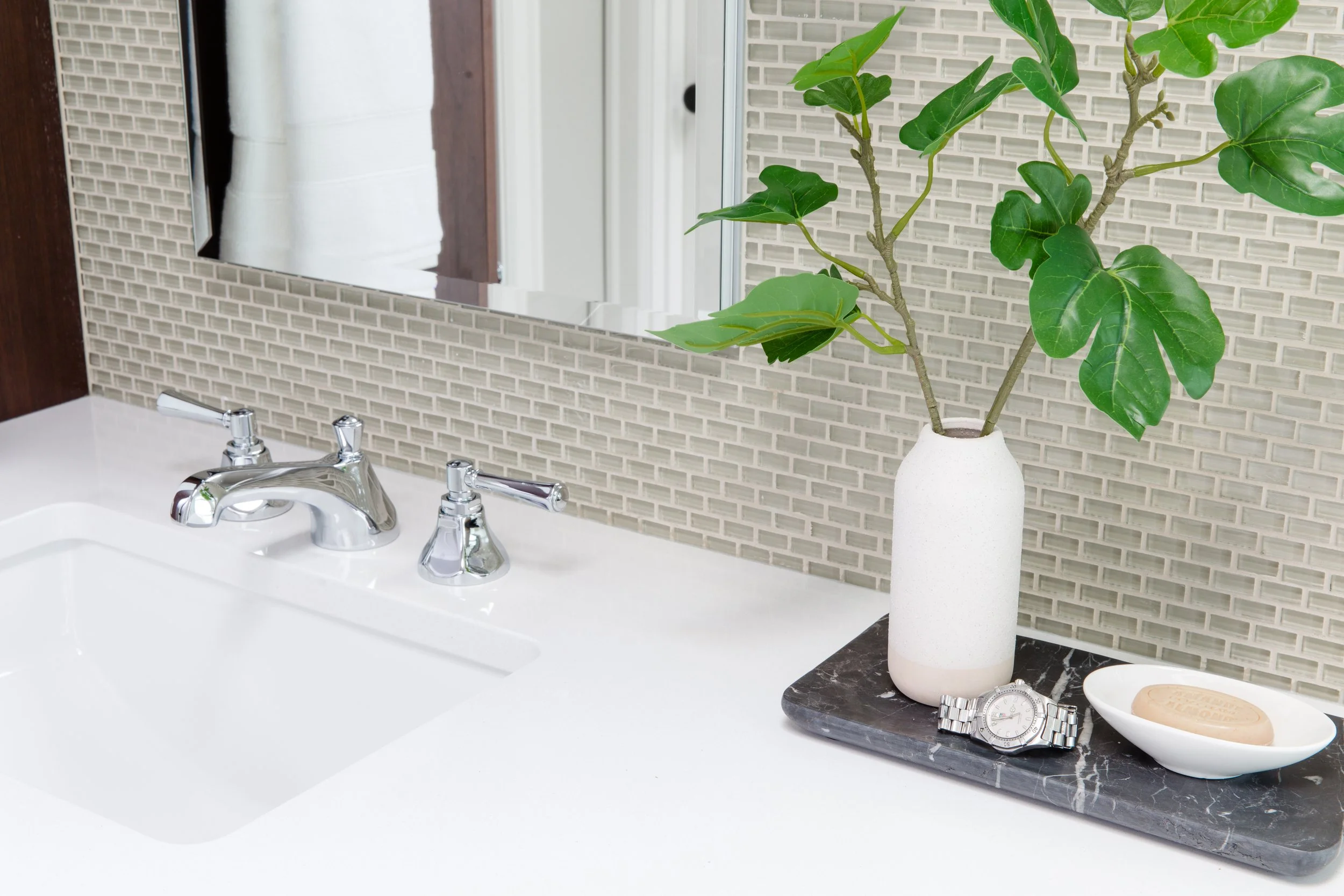 I love a pretty tray on my vanity tops. Not only does it provide a great way to organize loose items that collect on your counter, but it also makes counter cleanup quick and easy.