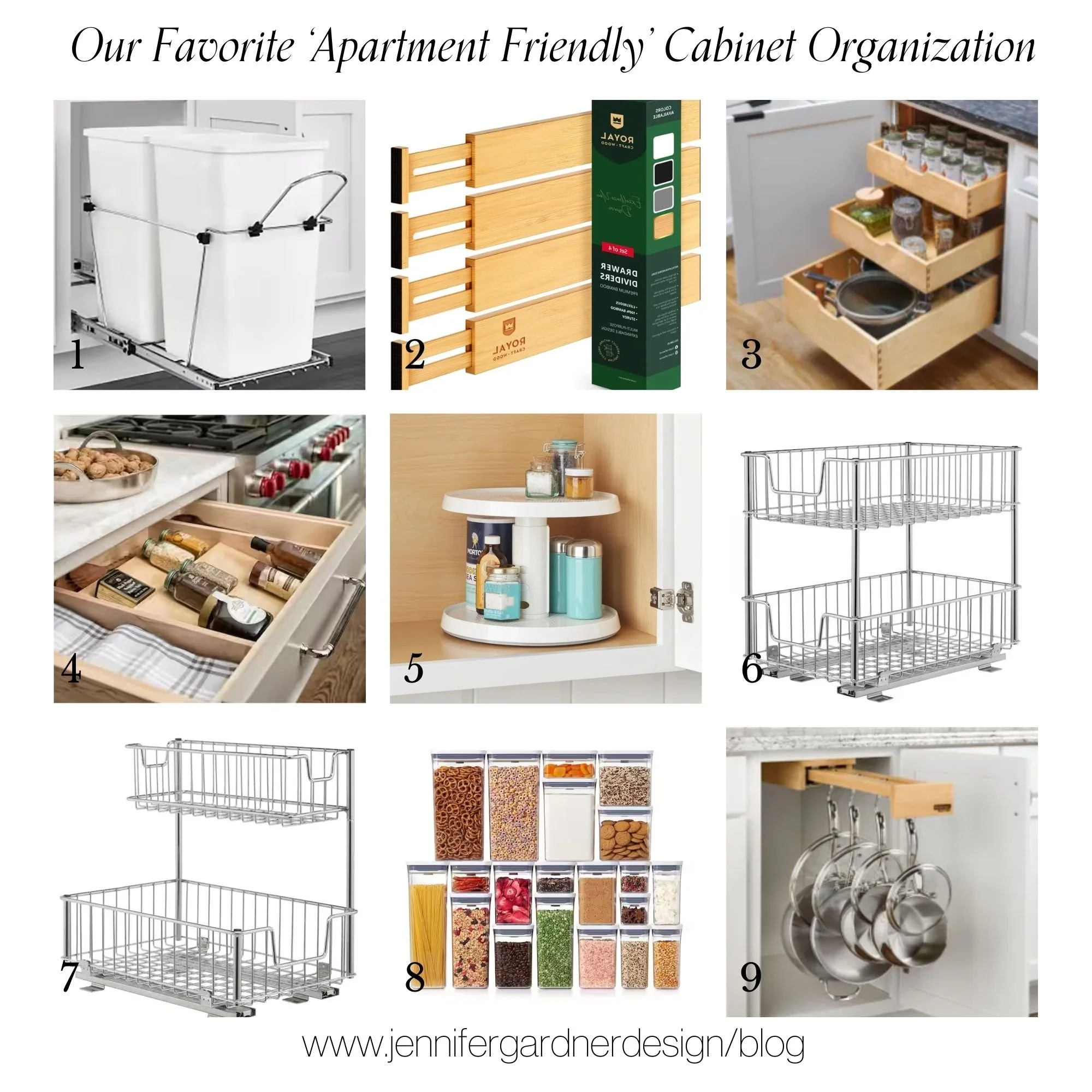 Organize your cabinets to maximize your workflow in the kitchen. There are some fantastic options available online that will take your cabinets from a hot mess to beautifully organized and personalized for your cooking priorities. Check out some of our favorite apartment friendly cabinet organization solutions below.