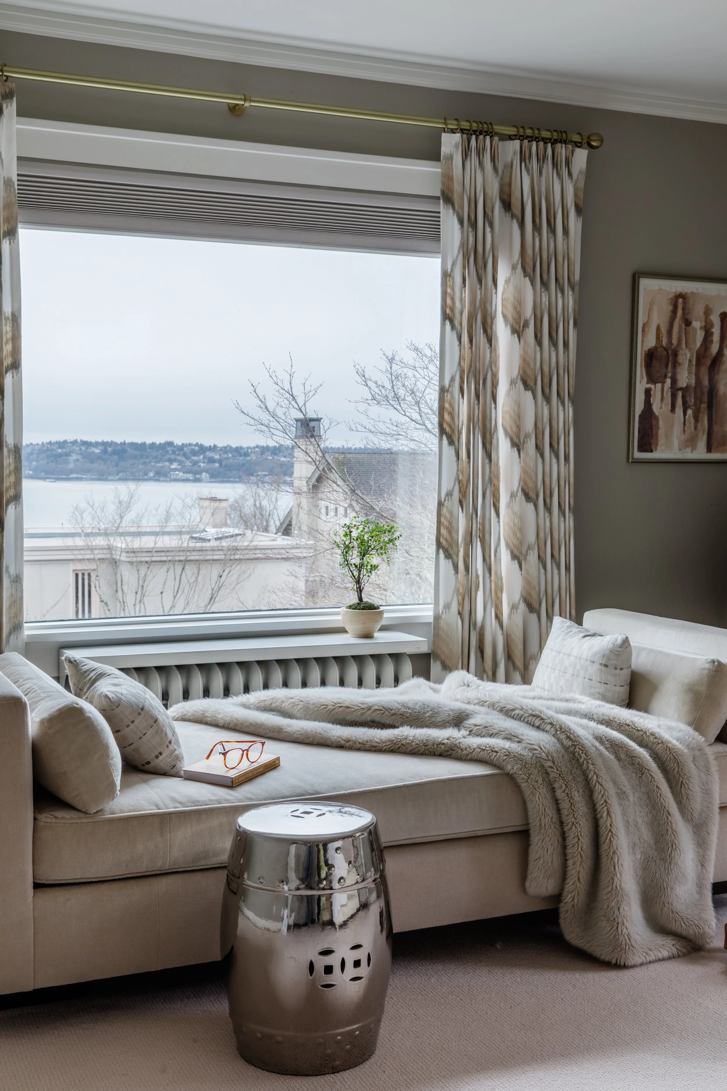 To create an illusion of a larger window and more expansive walls, install your drapery rod 3-6 inches above the top of your window trim and extend the rod 6 to 10 inches beyond the window frame. This allows more light to enter and makes the window seem wider than it actually is.