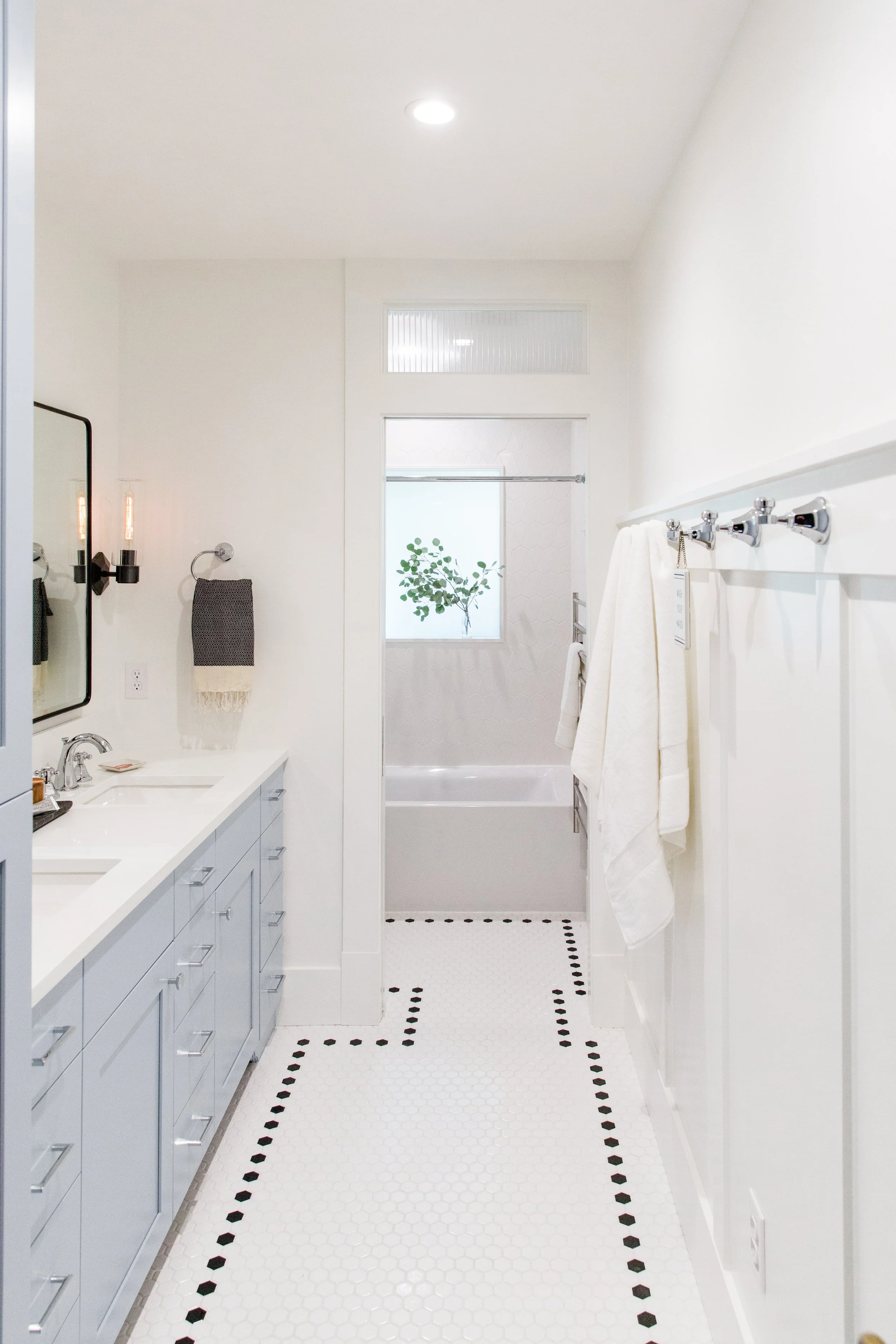 Pro Tip: If you opt for a tub/shower combination, I recommend a shower curtain rather than a glass shower screen so that you have full access to the tub. This makes bathtime with tiny kiddos and pets much easier to manage! Choose a fixed shower curtain rod instead of a tension rod, which can slip out of place over time.