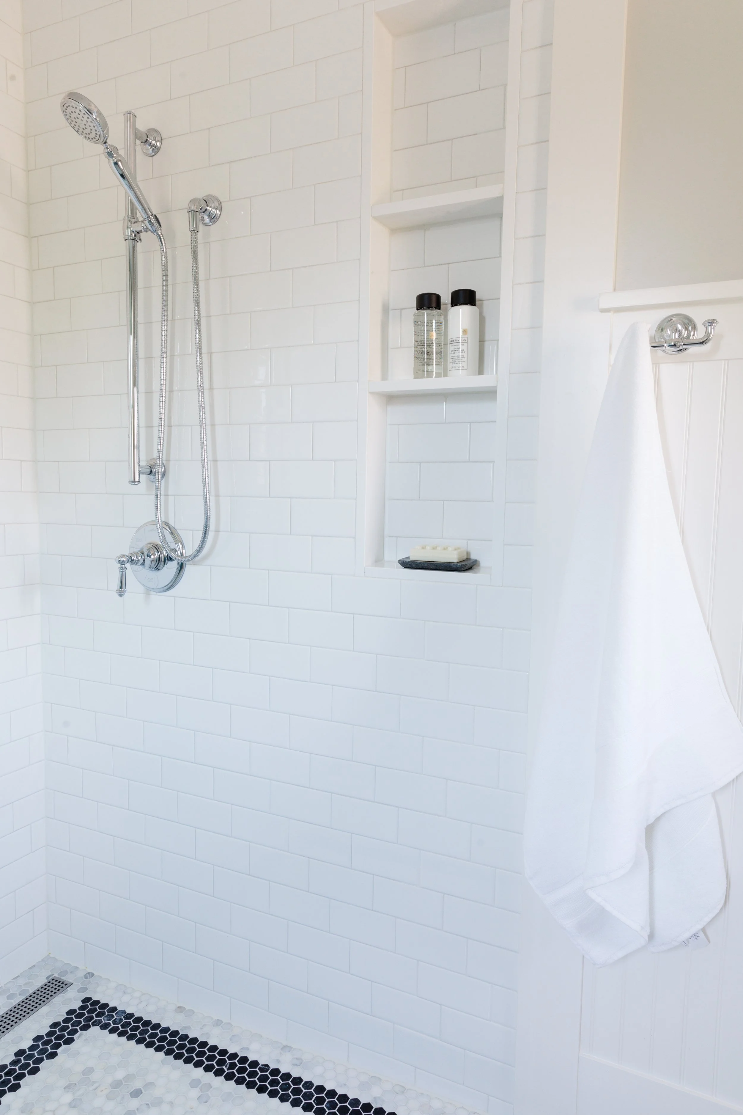 When it comes to shower solutions and convenience, I typically recommend including a handheld shower option. A handheld can be your primary shower head installed on a slide bar, making it convenient for everyone in the household regardless of their physical height. It can also be a secondary shower head attached to the side of the shower with a clip. From a functional perspective, the handheld shower on a long hose makes cleaning your shower or washing your pet an absolute breeze!